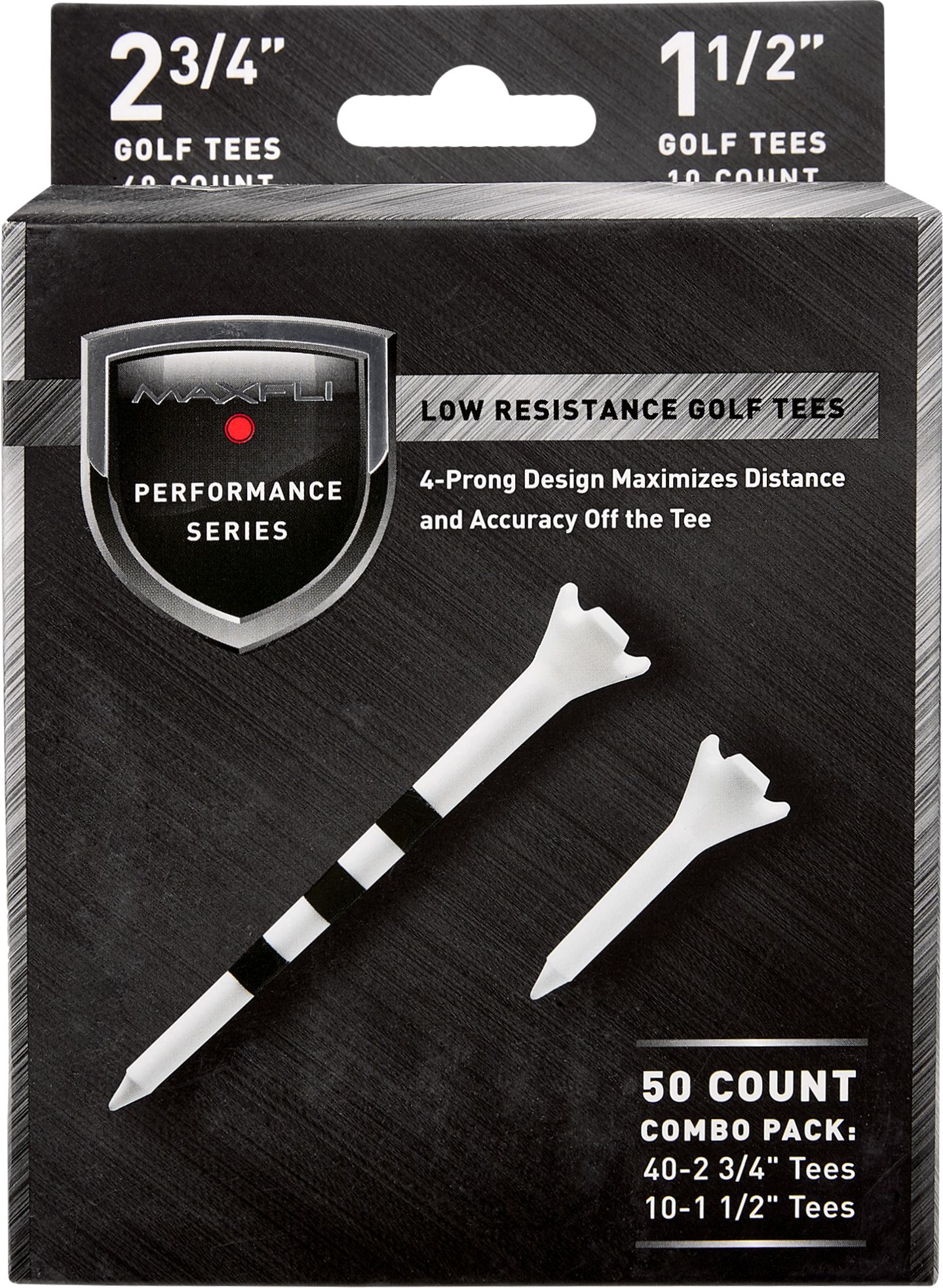 Get a leg up out of the box with Maxfli Performance Series Low Resistance 2 3/4” & 1 1/2” White Golf Tees. 4-prong design minimizes contact between tee and ball, maximizing performance off the tee, while less drag translates to more distance when you need it most. The Optimal Launch System uses 3 bands to promote consistent height and help dial in desired launch, with the bottom band encouraging higher launch and so on.